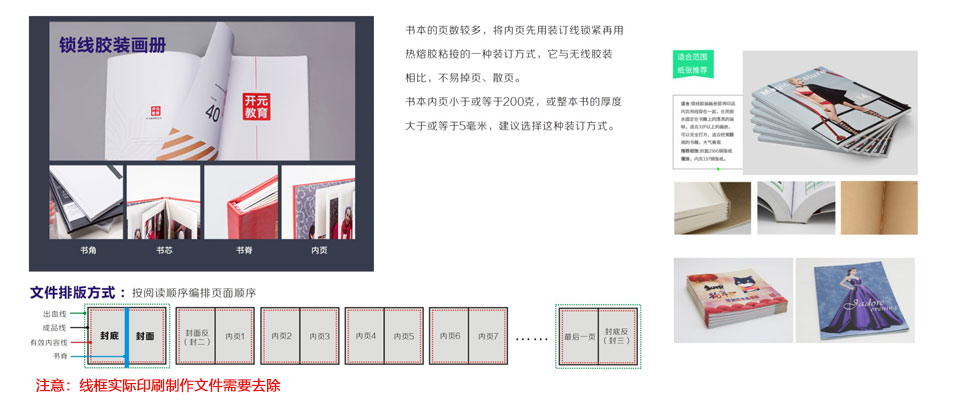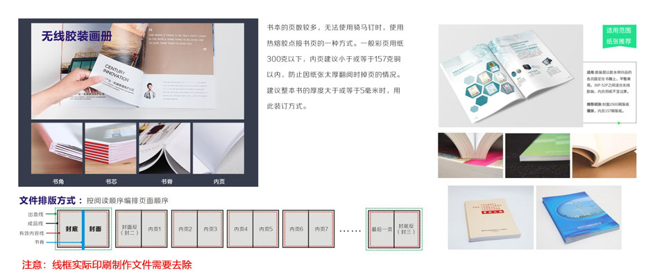 6、胶装是热熔胶粘合成的,整本书无法与骑马订一样全部摊开翻阅,所以内页的有效内容四边距离成品边需大于或等于5mm。